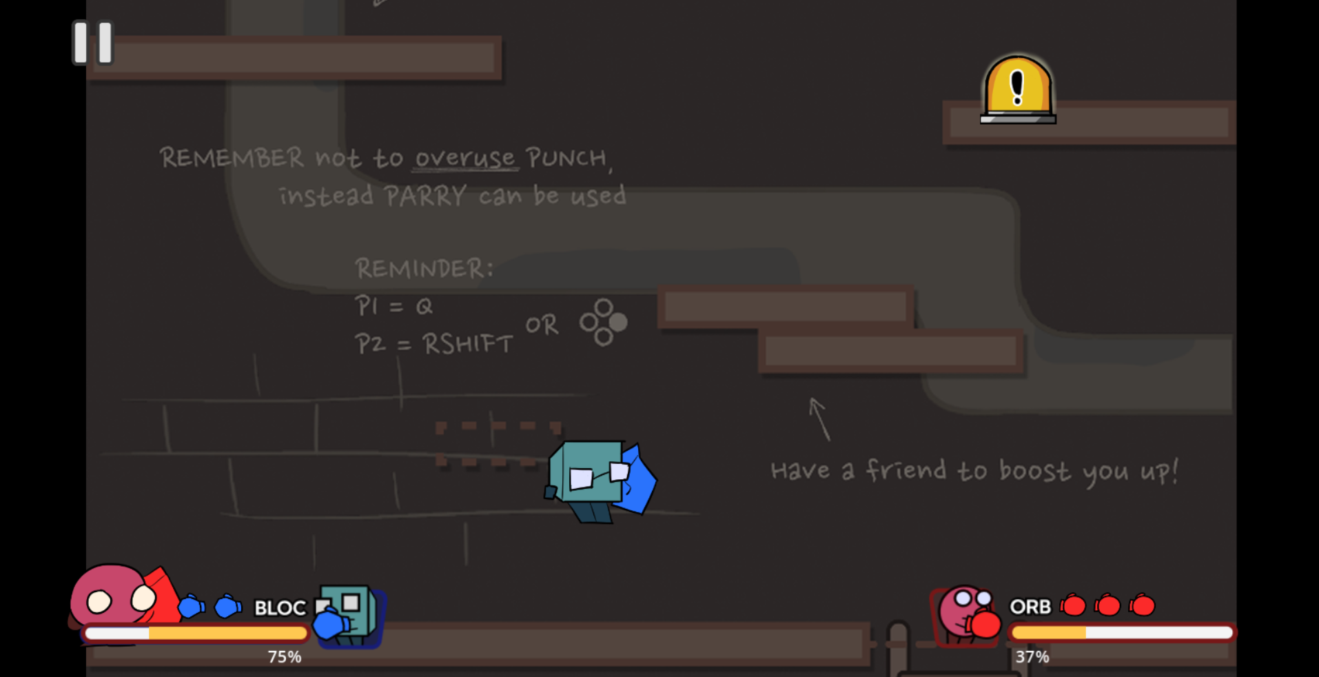 Progress by hitting switches, getting awesome power-ups, and most importantly uppercutting each other to get to hard to reach platforms.